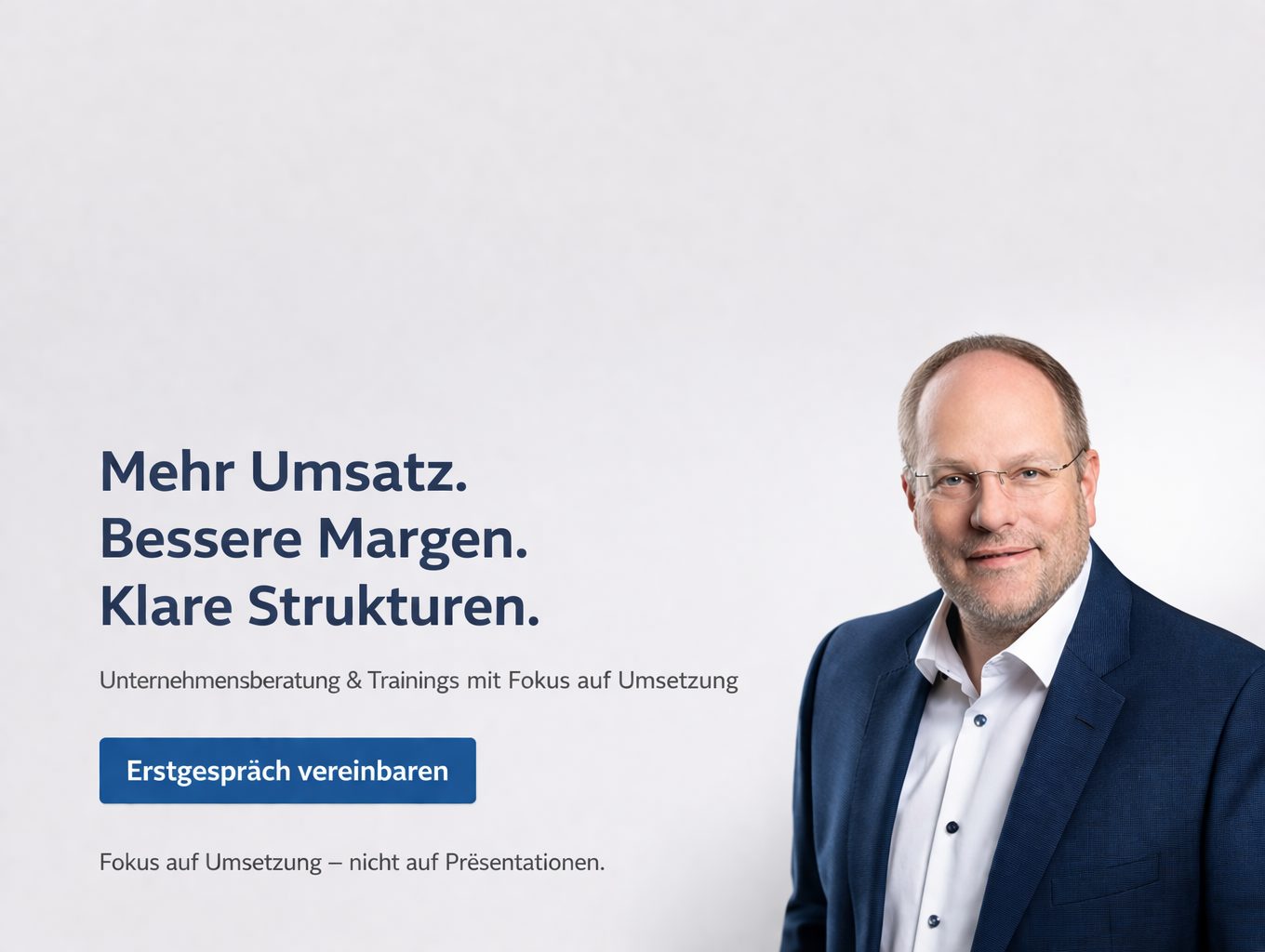 Unternehmen brauchen heute keine Konzepte, die nur auf dem Papier gut aussehen. Sie brauchen Klarheit, Prioritäten und Maßnahmen, die im Alltag funktionieren. Genau hier setzt meine Unternehmensberatung an. Ich begleite Unternehmen dabei, wirtschaftliche Potenziale sichtbar zu machen und gezielt zu nutzen – in Vertrieb, Preisstrategie, Organisation, Führung und Produktmanagement. Im Zentrum steht immer die Frage: […]